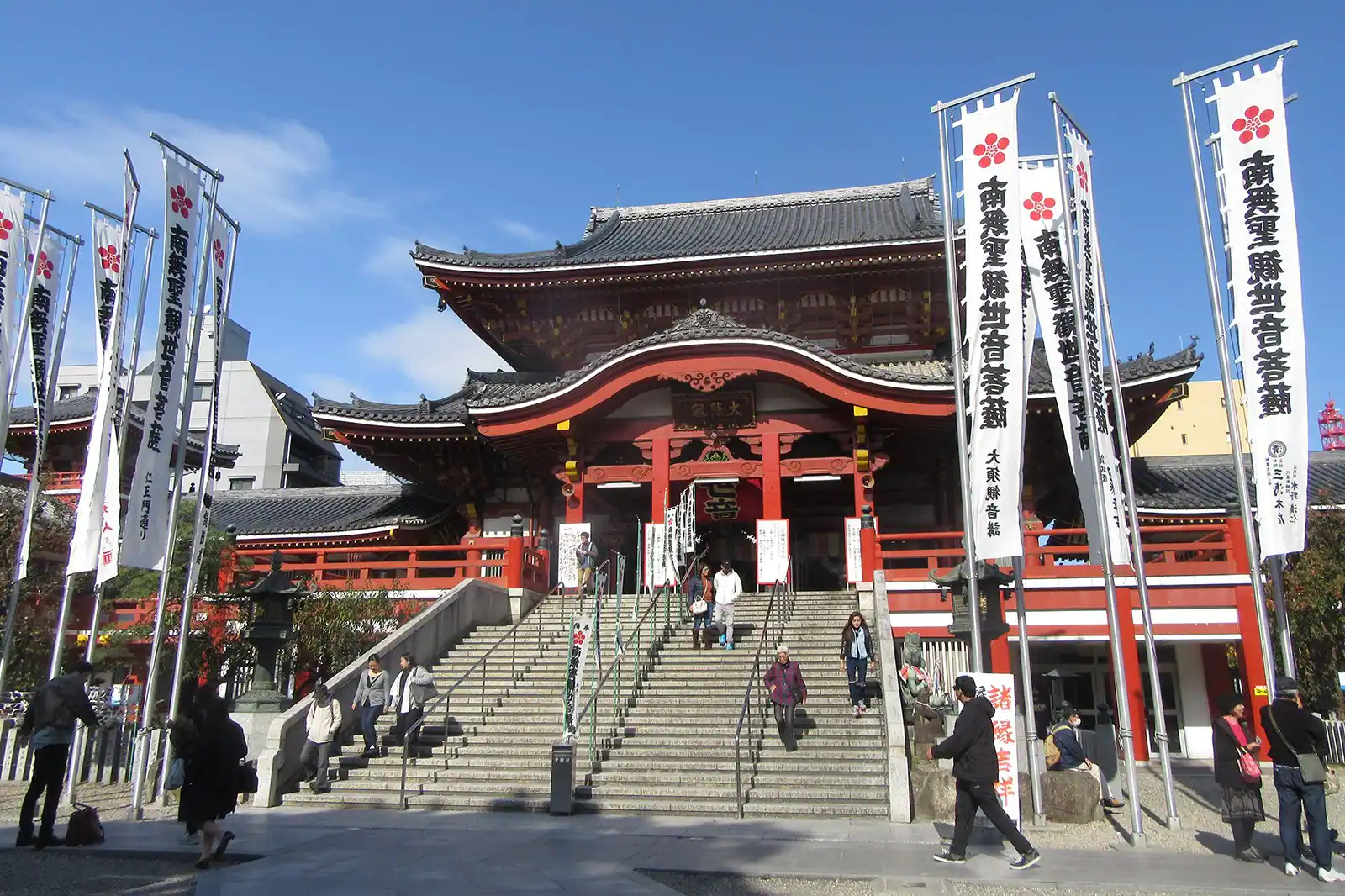 오스 칸논에서는 신성한 공간인 절을 둘러보면서 쇼핑도 즐길 수 있는 특별한 명소예요. 1612년에 지어진 이곳은 17세기에 현재 위치로 옮겨졌죠. 지금의 오스 칸논은 1970년대에 지어졌는데요. 일본식 탑, 수십 개의 불상, 그리고 거대한 붉은 종이등도 당시에 함께 세워졌습니다. 매월 18일과 28일에는 벼룩시장이 열립니다. 벼룩시장이 열리지 않는 날에도 사원 바로 옆에 있는 오스 상점가에는 기념품, 생활용품, 전통 공예품, 음식, 골동품 등을 판매하는 상점이 많이 자리하고 있어 항상 활기차고 생기가 넘쳐요.