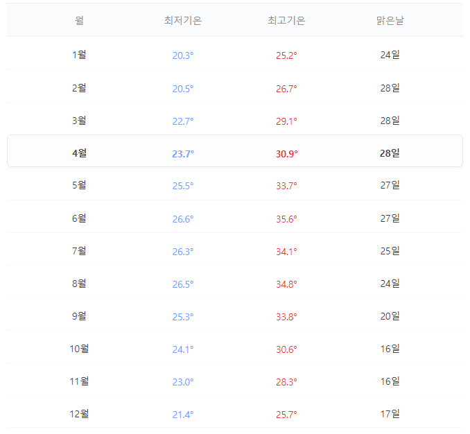1~3월은 맑은 날이 많고 낮기온 29도 이내로 활동하기 좋습니다. 1~3월은 강수량 및 기온 모두 1년 중 가장 좋은 때입니다. 건기는 1~7월로 4~7월도 강수량은 적은 편이지만 30도 이상의 높은 기온은 감안해야 합니다. 우기에는 우리의 장마처럼 하루종일 비 내리는 날이 많아 외부활동이 불편한 편입니다.