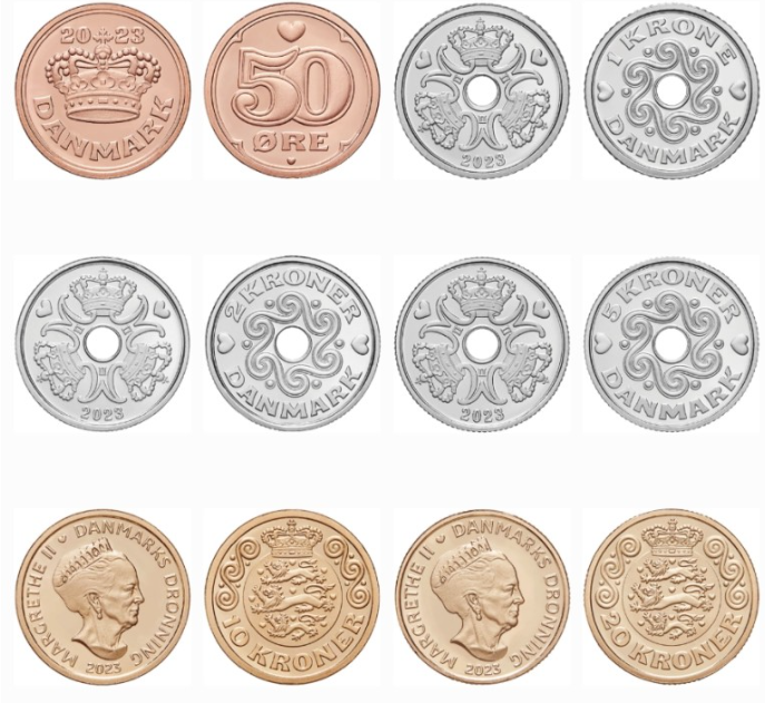 - 동전: 50 외레 (øre), 1 크로네, 2 크로네, 5 크로네, 10 크로네, 20 크로네