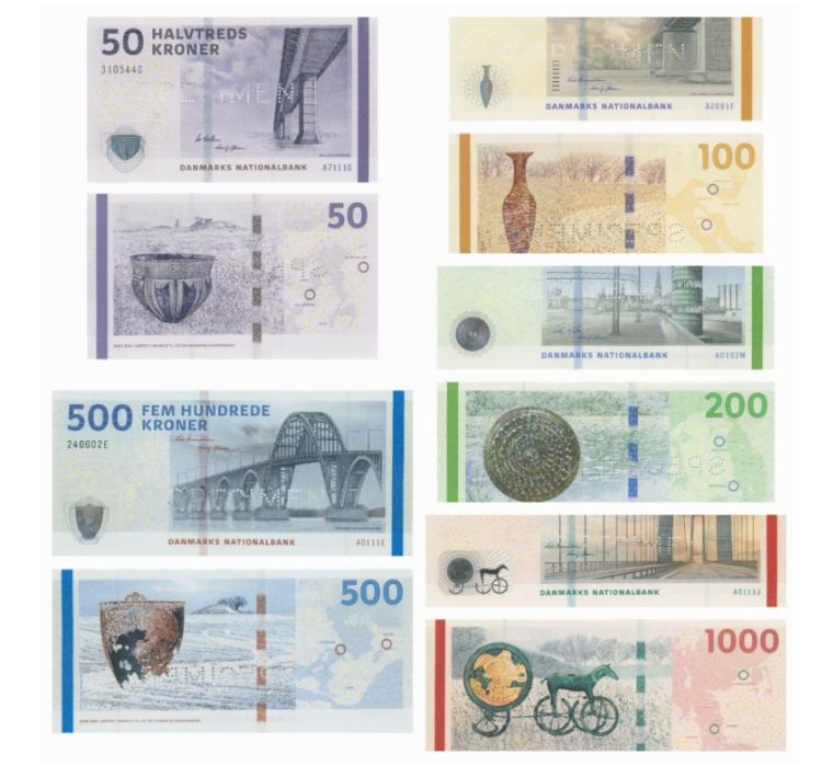 - 지폐: 50 크로네, 100 크로네, 200 크로네, 500 크로네, 1000 크로네