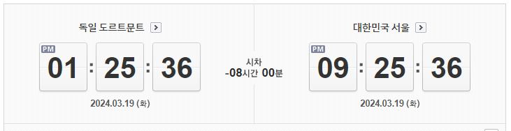 도르트문트와 서울의 시차는 8시간 입니다. 도르트문트가 서울보다 8시간 뒤에 있습니다. 즉, 서울이 오후 9시일 때, 도르트문트는 오후 1시입니다.