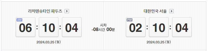 리히텐슈타인과 대한민국 서울의 시차는 8시간입니다. 리히텐슈타인이 서울보다 8시간 뒤에 있습니다. 즉, 서울이 오후 2시라면 리히텐슈타인은 오전 6시입니다.
