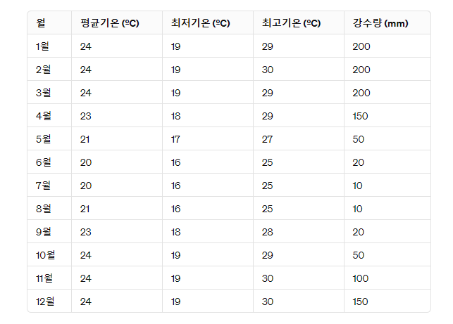 평균기온: 18°C ~ 24°C 상대적으로 시원한 날씨가 이어지며, 가장 건조한 시기이지만 가끔씩 습도가 높아져 소나기가 내릴 수 있습니다.