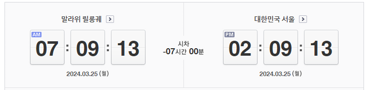 말라위와 대한민국 서울의 시차는 7시간입니다. 서울이 말라위보다 7시간 빠릅니다. 즉, 서울이 오후 2시라면 말라위는 오전 7시입니다.