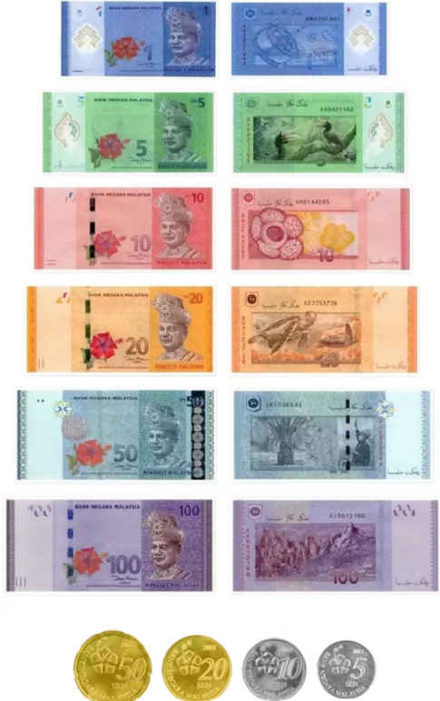 - 지폐: RM1, RM5, RM10, RM20, RM50, RM100