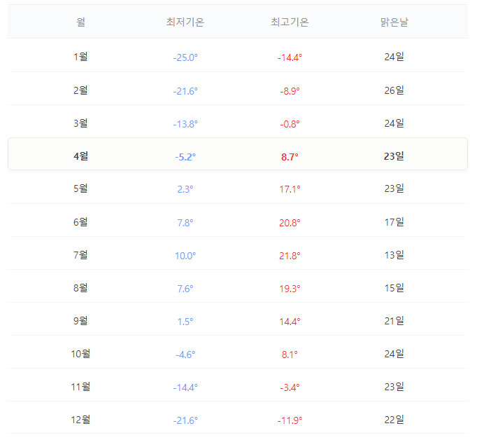 여행 최적기 5~8월이나 9월 초에 여행을 계획하는 것을 추천합니다. 여행의 최적기는 5~9월이며, 바다가 없는 내륙국 특성상 사계절 중 겨울이 가장 길고, 겨울에는 평균 영하 30~40까지 내려가는 경우가 많아 여행하기 어렵습니다.