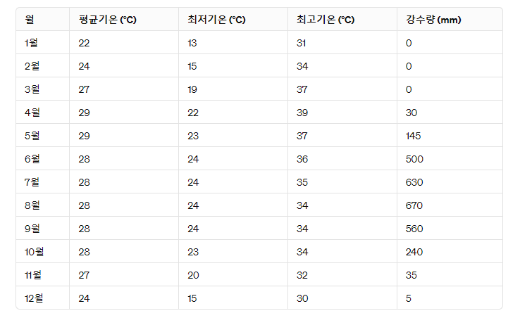 여름에는 양곤이 가장 더운 시기를 겪습니다. 평균 기온은 30°C를 넘어가며, 최고 기온은 종종 35°C 이상으로 치솟습니다. 강수량이 가장 많은 계절로, 가끔씩 강한 소나기가 내리기도 합니다.