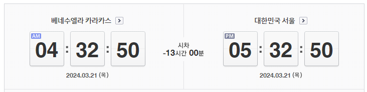 대한민국 서울과 베네수엘라의 시차는 13시간입니다. 대한민국 서울이 베네수엘라보다 13시간 빠릅니다. 즉, 서울이 오후 5시라면, 베네수엘라는 오전 4시입니다.