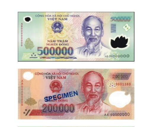 베트남의 화폐는 베트남 국영은행에서 발행하며 500,000동, 200,000동, 100,000동, 50,000동, 20,000동, 10,000동, 5,000동, 2,000동, 1,000동, 500동, 200동, 100동의 12종이 있으며 1만동 이상의 지폐는 폴리머 재질, 5천 이하의 지폐는 일반 면소재의 지폐입니다.