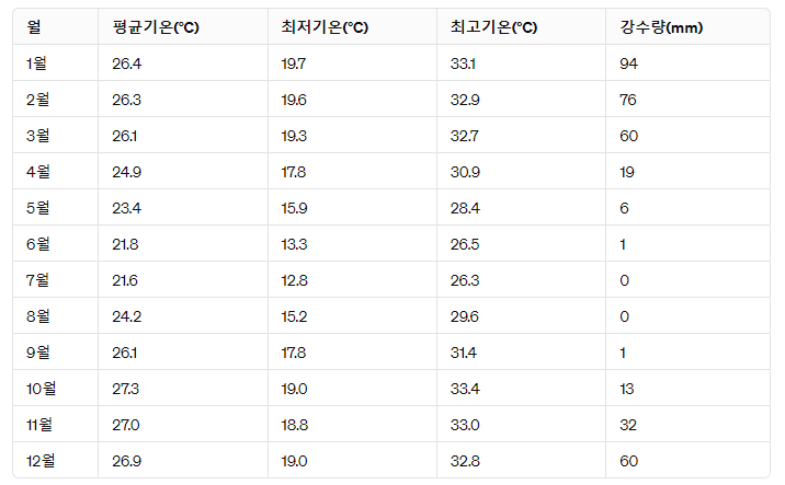가을은 여름의 더위가 식고, 기온이 서서히 쌀쌀해지는 시기입니다. 평균 최고 기온은 약 25°C에서 30°C 정도로 낮아지며, 일교차가 줄어듭니다. 가끔씩 가벼운 강우가 있을 수 있으나 전체적으로는 건조한 날씨가 지속됩니다.