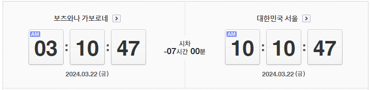 대한민국 서울과 보츠와나 간의 시차는 7시간입니다. 보츠와나가 서울보다 7시간 뒤에 있습니다. 예를 들어, 서울이 오전 10시라면 보츠와나는 오전 3시입니다.