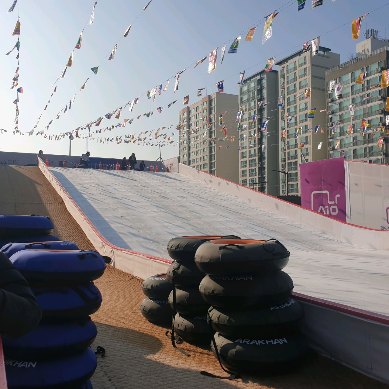 썰매장에 도착하자마자 매표소에서 입장권을 구매하고, 썰매를 타기 위해 줄을 섰습니다. 안전요원들이 곳곳에 배치되어 있어 질서 있게 운영되고 있는 모습이 인상적이었습니다.