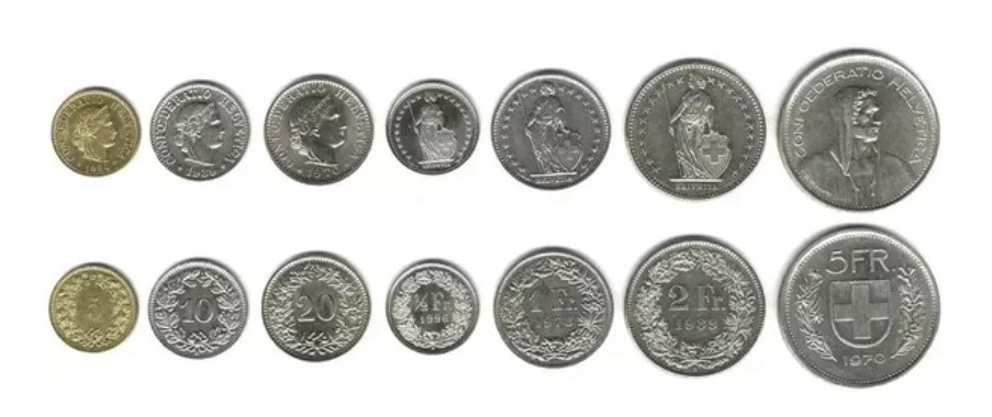 - 동전: 5 라펜(센트), 10 라펜, 20 라펜, 50 라펜, 1 프랑, 2 프랑, 5 프랑