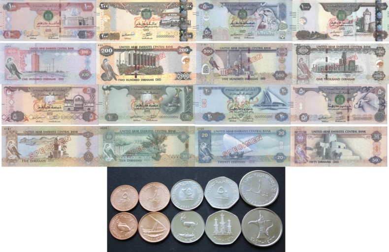 - 지폐: 5 디르함, 10 디르함, 20 디르함, 50 디르함, 100 디르함, 200 디르함, 500 디르함, 1000 디르함