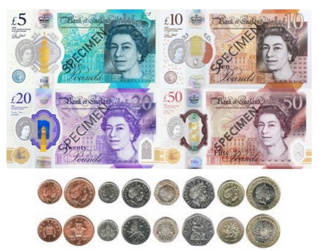 - 동전: 1펜스, 2펜스, 5펜스, 10펜스, 20펜스, 50펜스, £1, £2