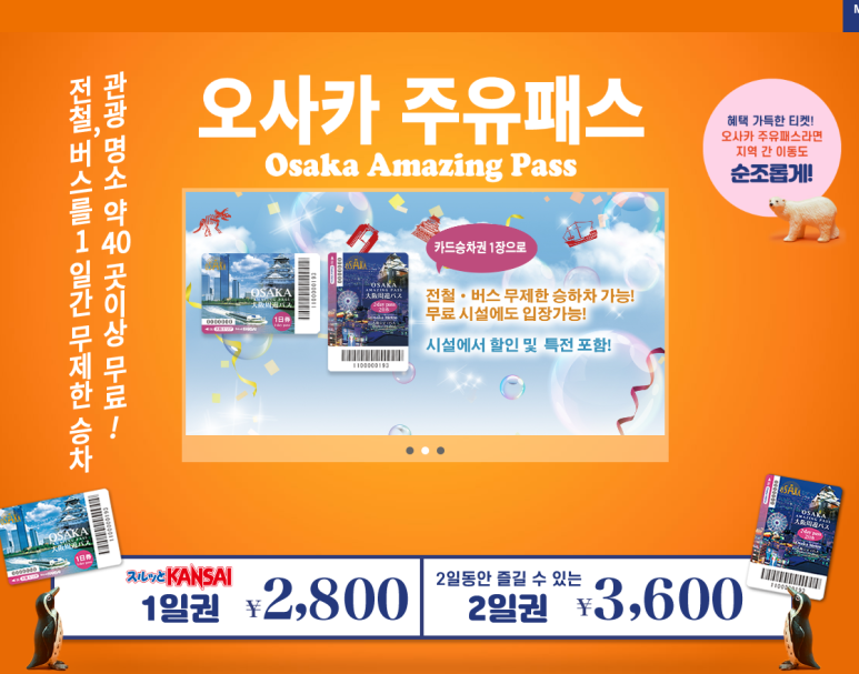 - 1일 패스(2,800엔): 이 패스는 구매한 날짜를 포함하여 24시간 동안 사용할 수 있습니다. 이 기간 동안 오사카 시내의 대중교통을 무제한으로 이용할 수 있으며, 또한 일부 관광지에 무료로 입장할 수 있습니다.