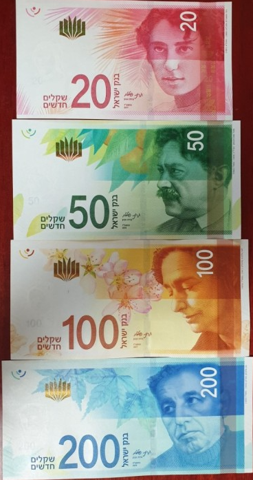 - 셰켈 지폐는 20, 50, 100, 200 셰켈
