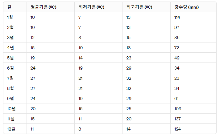 겨울에는 조금 추워지는데, 낮에는 10도에서 15도 정도의 기온을 보이며, 밤에는 더욱 추워질 수 있습니다. 겨울에는 비가 많이 내리는 경우도 있으니 준비를 해야 합니다.