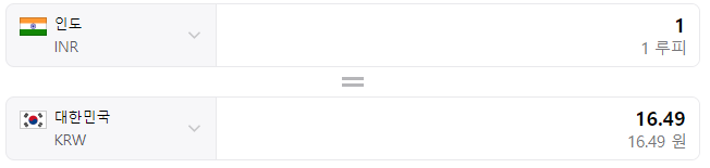 • 1 인도 루피 (INR) ≈ 16.49 한국 원 (KRW)