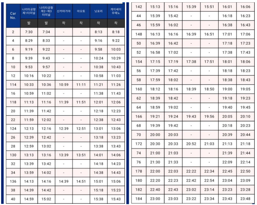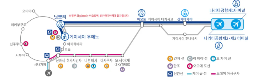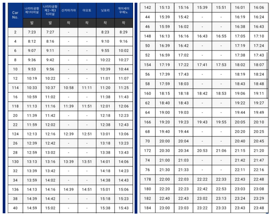 나리타공항에서 닛포리/케이세이 우에노 방면 시간표