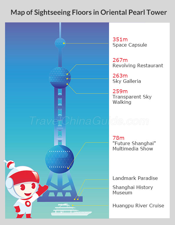 타워 안에는 전망대, 회의실, 전시장, 레스토랑, 쇼핑몰, 호텔 등이 있어 관광객들에게 다양한 경험을 제공합니다. 타워의 상단에는 크기가 다양한 11개의 구역으로 구성된 역사 박물관이 있으며, 중국의 역사와 문화를 소개하는 다양한 전시물이 전시되어 있습니다.