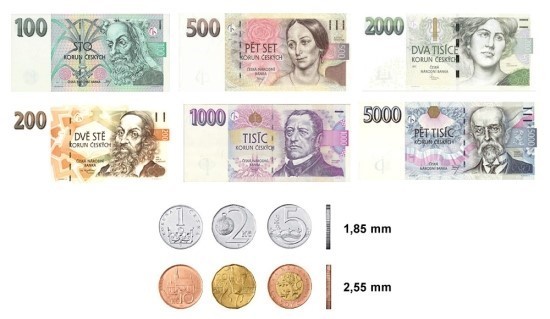 - 지폐: 100, 200, 500, 1,000, 2,000, 5,000 코루나