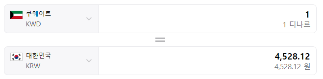 - 1 쿠웨이트 디나르 (KWD) ≈ 4,528 한국 원 (KRW)