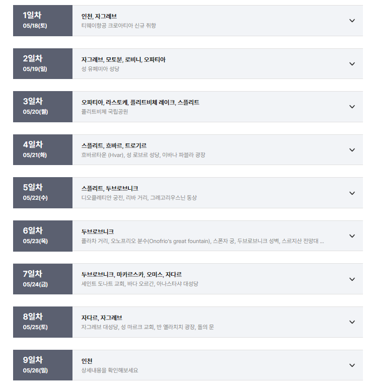 - 자그레브(1)-모토분-로비니-오파티아(1)-라스토케-플리트비체 레이크-스플리트(1)-흐바르-트로기르-스플리트(1)-두브로브니크(2)-마카르스카-오미스-자다르(1)-자그레브