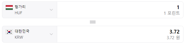 - 1 헝가리 포린트 (HUF) ≈ 3,72 한국 원 (KRW)