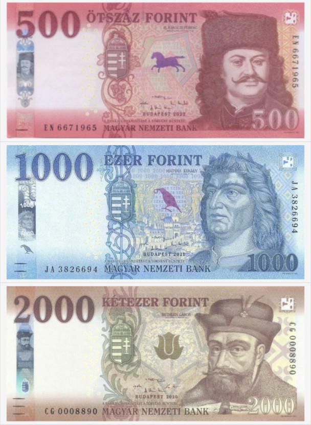 - 지폐는 500, 1,000, 2,000, 5,000, 10,000, 20,000 포린트 단위로 발행됩니다.