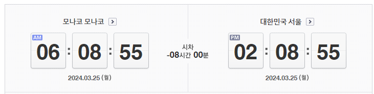 대한민국 서울과 모나코의 시차는 8시간입니다. 모나코는 서울보다 8시간 뒤에 있습니다. 즉, 서울이 오후 2시 일 때, 모나코는 오전 6시입니다.